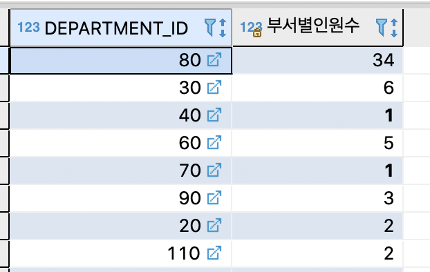 SELECT DISTINCT DEPARTMENT_ID, cnt_member(DEPARTMENT_ID) 부서별인원수