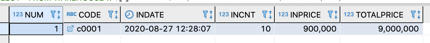 INSERT INTO warehouse(num, code, incnt, inprice, totalprice)