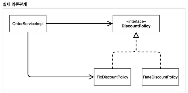 DIP: 주문 서비스 클라이언트(OrderServiceImpl)는 DiscountPolicy 인터페이스에 의존하면서 DIP를 지킨 것 같지만