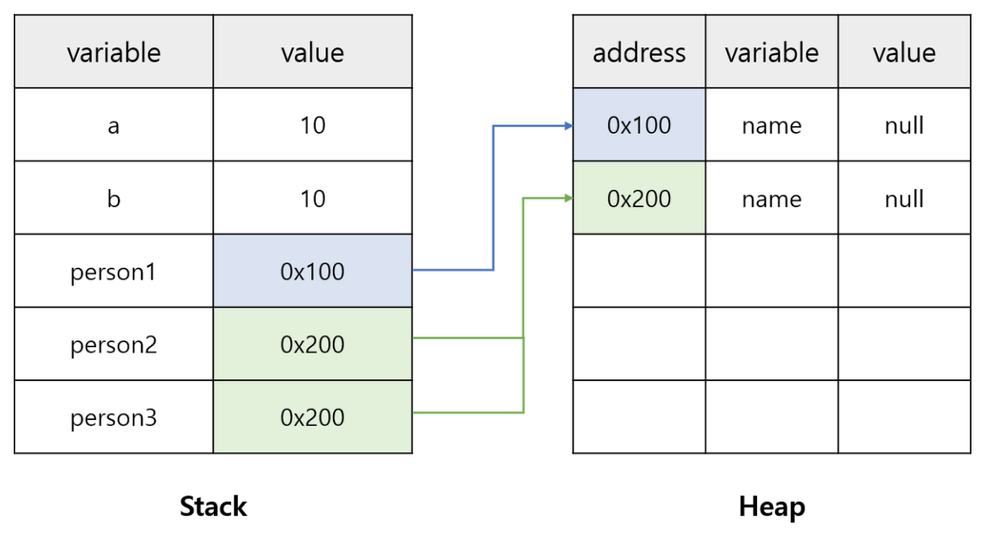 피연산자가 primitive type일 때는 값이 같은지 비교하고, reference type일 때는 가리키는 주소가 같은지 검사한다.