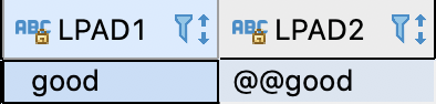 SELECT LPAD('good', 6) LPAD1, LPAD('good', 6, '@') LPAD2 FROM dual;