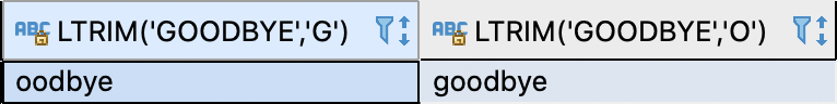 SELECT LTRIM('goodbye', 'g'), LTRIM('goodbye', 'o') FROM dual;