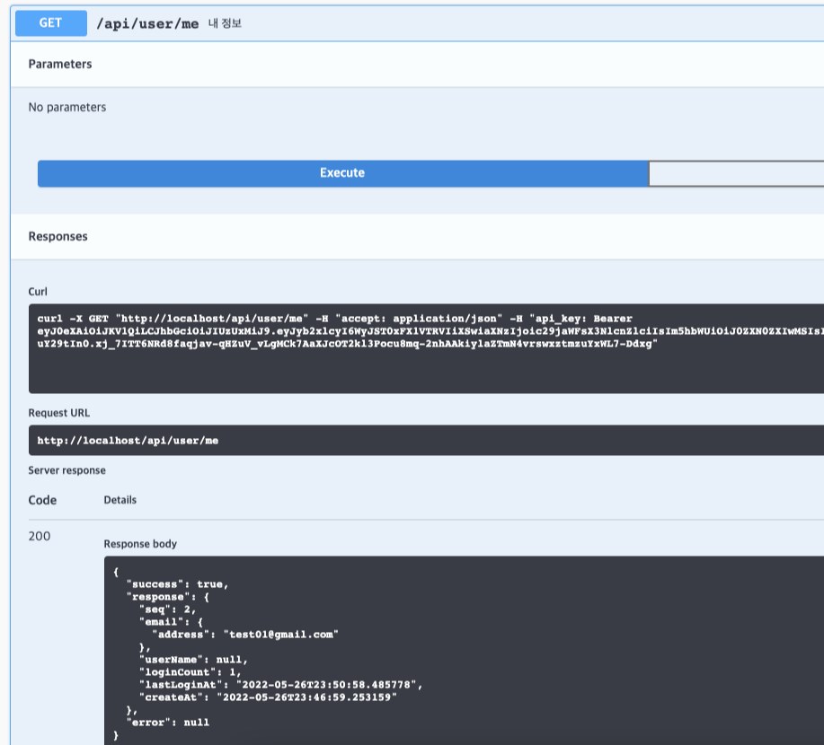 토큰 값 입력 후에는 인증 정보가 필요한 "내 정보" Method 에 접근이 가능하다.