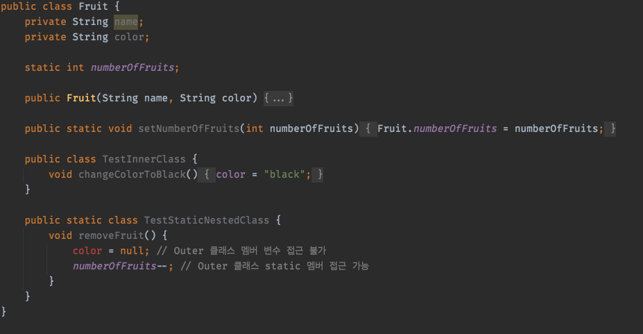 - static 중첩 클래스는 outer 클래스의 인스턴스 멤버에 접근할 수 없다. (개체의 참조를 통해서 접근)