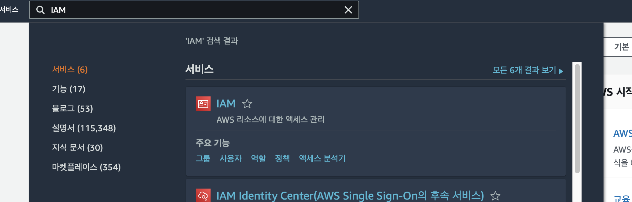 AWS Console 검색창에 'IAM' 검색 후 주요 기능의 '사용자' 클릭