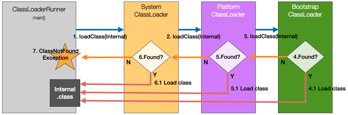 해당 클래스가 Bootstrap ClassLoader 를 사용하여 다시 로드하려고 하면 java.lang.ClassNotFoundException 예외가 발생한다.