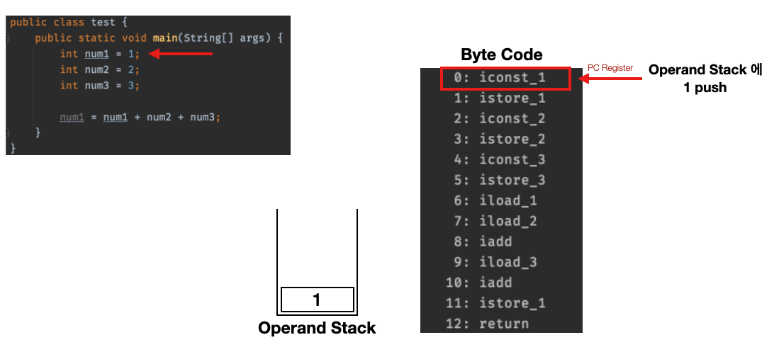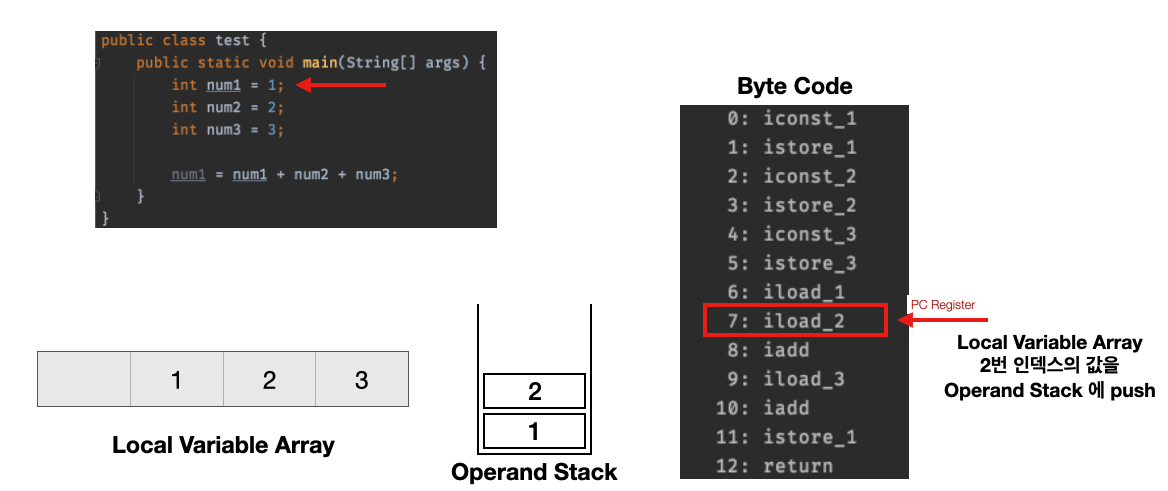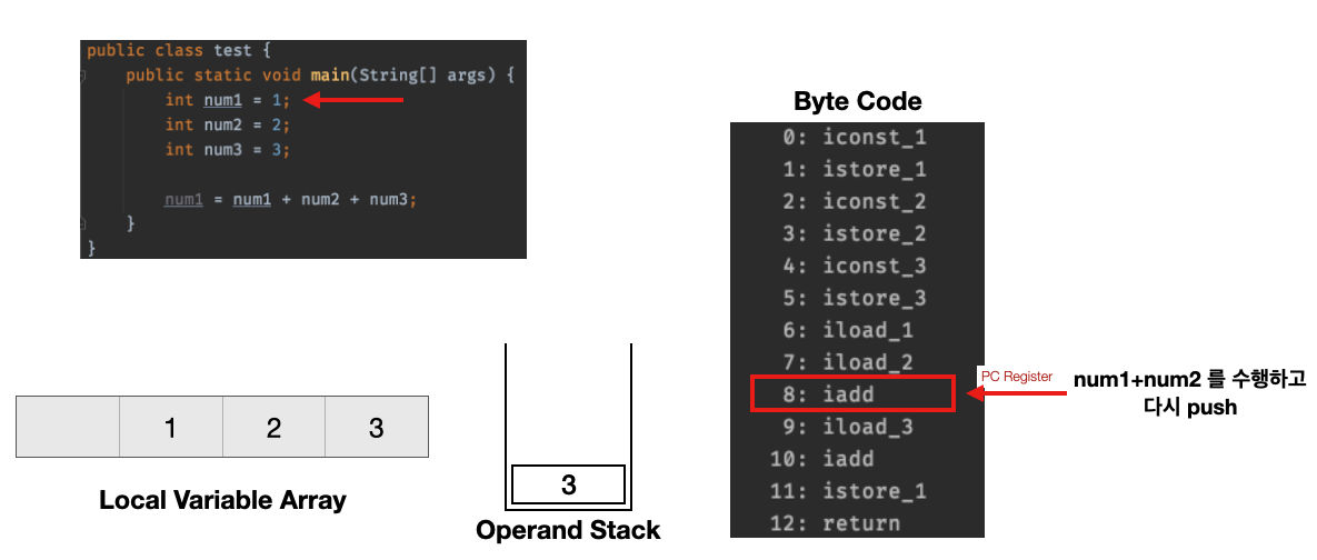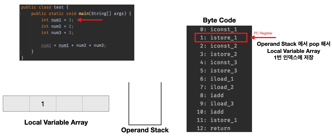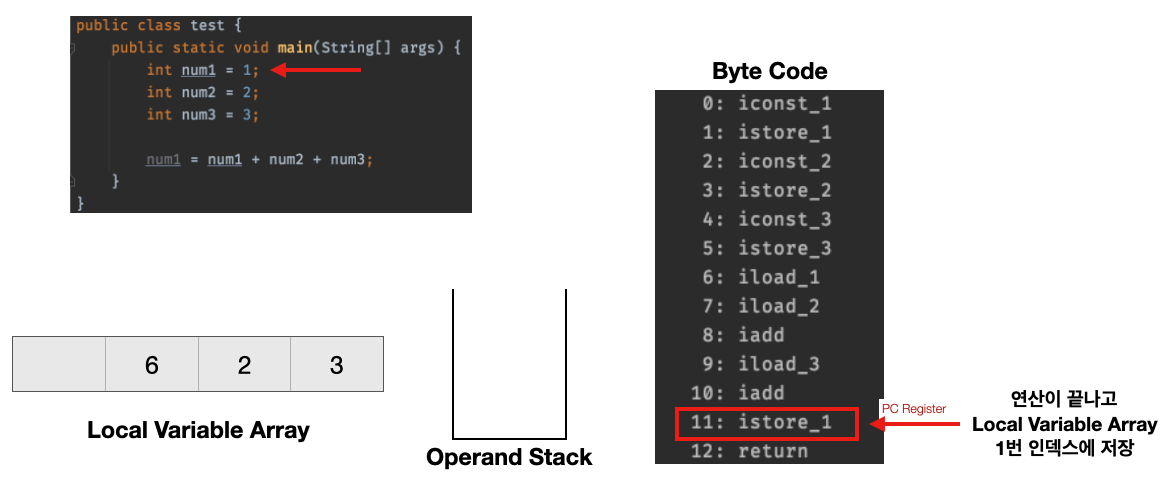 이렇게 바이트코드 0~5행까지 num1, num2, num3 을 Local Variable Array 에 저장하고