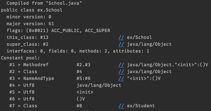 역어셈블링하여 확인한 School 클래스 파일의 Constant pool 은 다음과 같다.