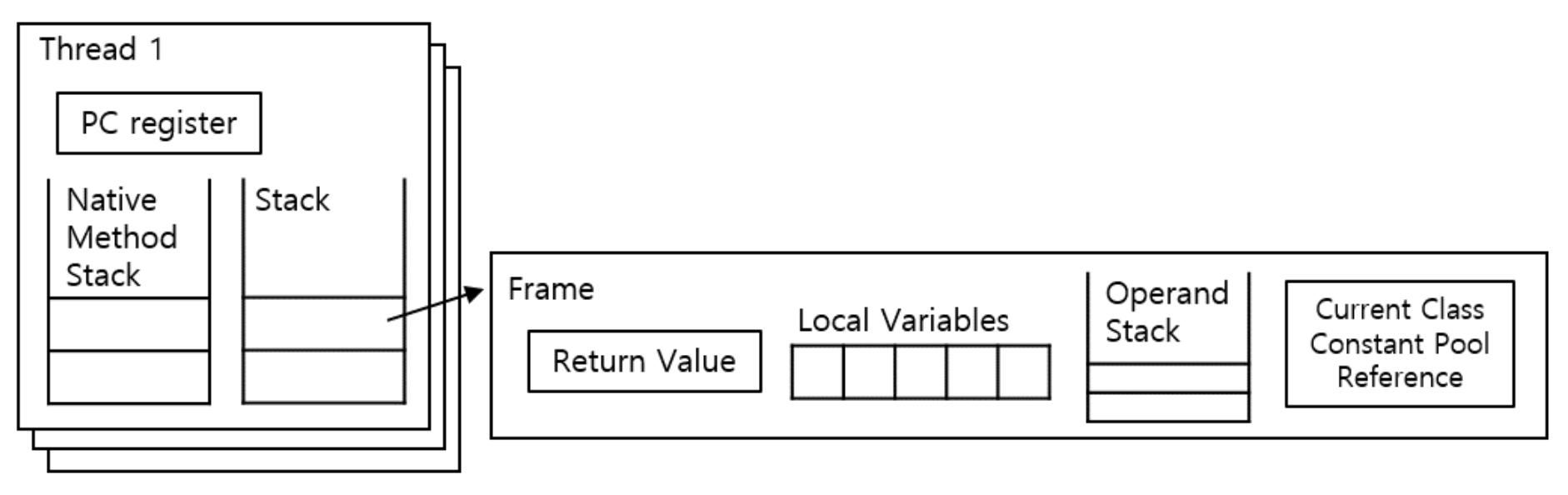 다음으로는 Thread 마다 1개씩 존재하는 Java Stack, PC(Program Counter) Register, Native Method Stack 에 대해서 알아보자.