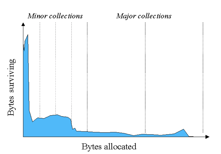 그래프의 분포를 보면 왼쪽에 수명이 짧은 객체가 엄청나게 많다. 대부분의 객체는 짧은 시간동안 사용되고 메모리가 해제되는 것이다.